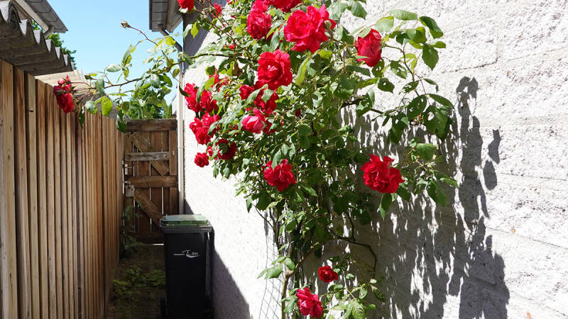 Inmiddels is de rozenstruik uitgegroeid en loop ik met plezier door de doorloop om de vuilnisbakken buiten te zetten.
