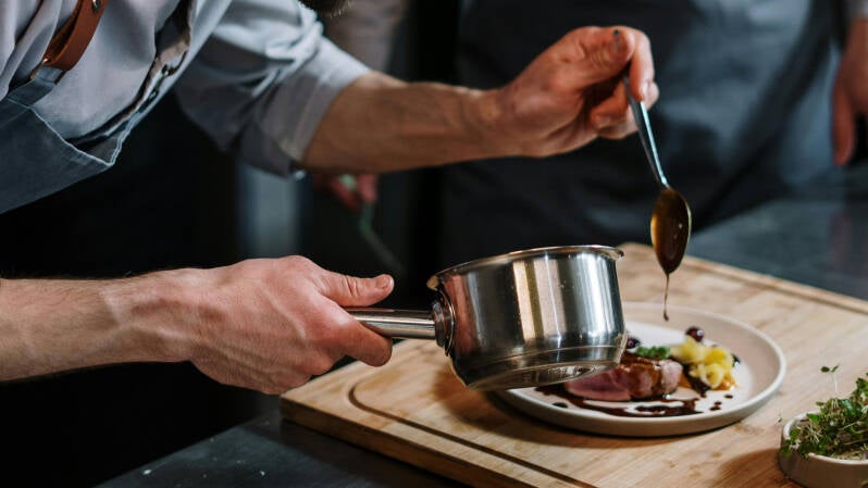 Wat mij laatst opviel was dat een tv-kok iets lekkers had gemaakt en een speciaal sausje niet over het gerecht heen had gedaan, maar naast het gerecht gedruppeld en geknoeid. Ik weet niet hoe je dat dan kunt eten. Die druppels kun je zeker niet op een vorkje krijgen en ook moeilijk op een lepeltje.